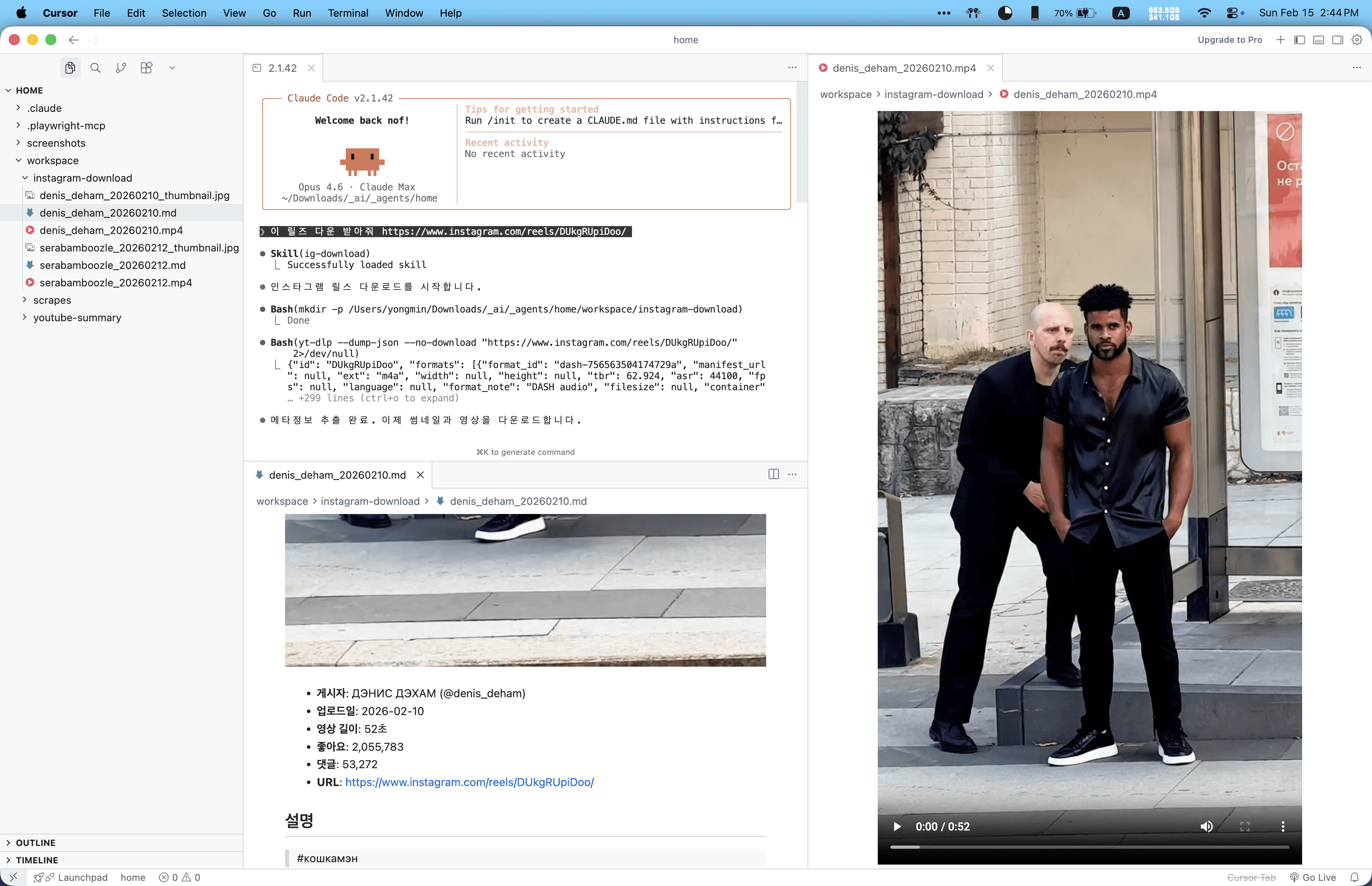 클로드 코드에서 인스타그램 다운로드 스킬 사용 화면